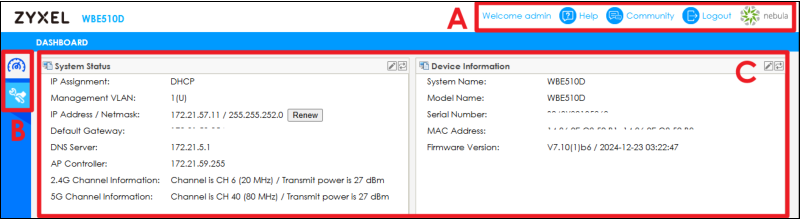 The following summarizes how to navigate the Web Configurator from the Dashboard screen. The figures below show the Dashboard screen in standalone mode, cloud managed mode, and controller managed mode. The screen layout may differ slightly depending on the mode and device model.