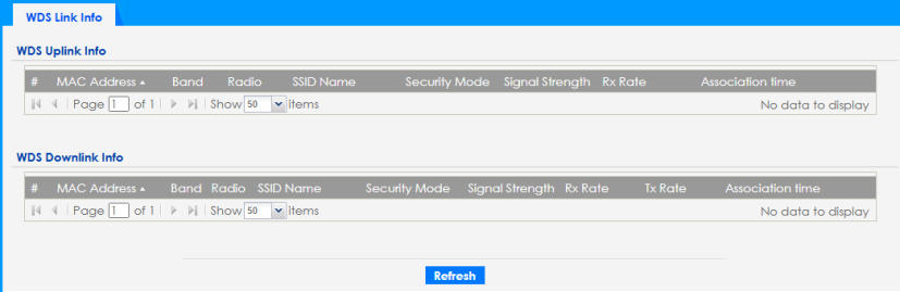 The WDS Link Info screen (WDS Link Info) displays statistics about the Zyxel Device’s WDS (Wireless Distribution System) connections.