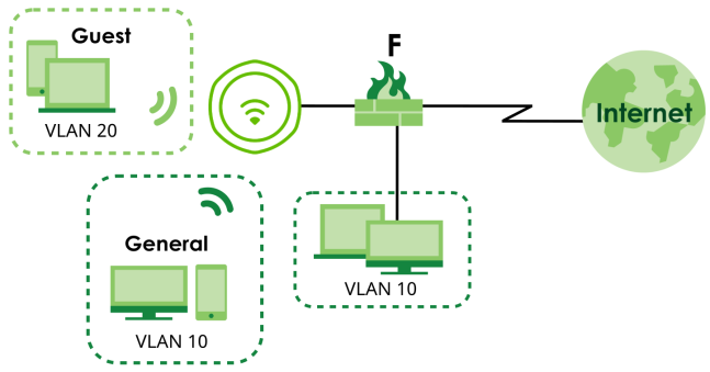 For the Guest WiFi, enable Enable Intra-BSS Traffic blocking to prohibit Guest WiFi clients from directly connecting to each other. To separate the Guest WiFi network from the General internal WiFi network, create two VLANs, VLAN 10 and VLAN 20, on your firewall (F), such as ZyWALL. Set the General WiFi network to be in VLAN 10, where your internal network is. Set the Guest WiFi network to be in VLAN 20. This way, Guest WiFi clients will not be able to access the wired LAN network of the firewall (F) in VLAN 10 while still able to access the Internet.