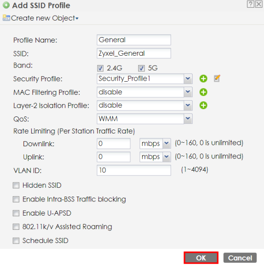 2 Configure the first SSID – Zyxel_General using the parameters given above, and then click OK.