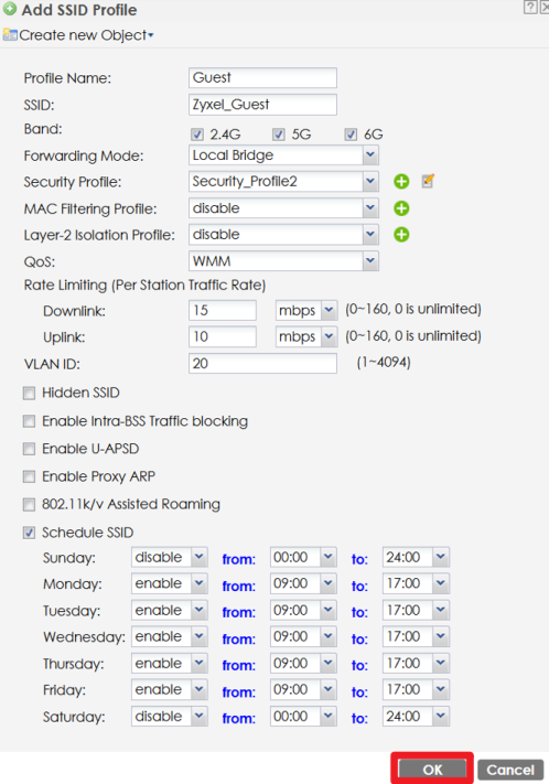 3 Configure the second SSID – Zyxel_Guest using the parameters given above, and then click OK.
