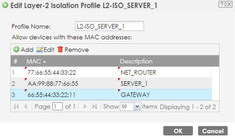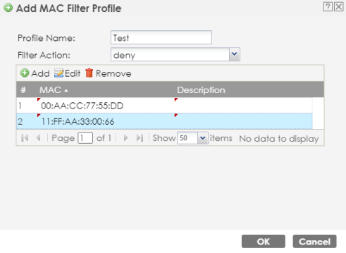 8 Enter the MAC address of the device Alice uses to connect to the network in Set 1’s MAC Address field and enter her name in the Description field, as shown in the following figure. Change the Profile Name to “MacFilter_SERVER_1”. Select Allow from the Filter Action field and click OK.