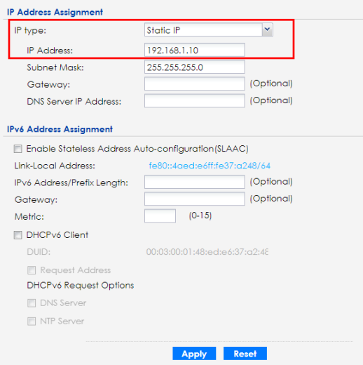 2 Go to the Configuration > Network > IP Setting screen in the Web Configurator. Select the IP type to Static IP and specify a preferred IPv4 address in the IP Address field, for example, “192.168.1.10”. After clicking Apply, you will be disconnected from the Web Configurator due to the IP address change.