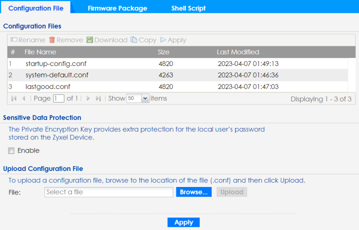 File Name | This column displays the label that identifies a configuration file. You cannot delete the following configuration files or change their file names. The system-default.conf file contains the Zyxel Device’s default settings. Select this file and click Apply to reset all of the Zyxel Device settings to the factory defaults. This configuration file is included when you upload a firmware package. The startup-config.conf file is the configuration file that the Zyxel Device is currently using. If you make and save changes during your management session, the changes are applied to this configuration file. The Zyxel Device applies configuration changes made in the Web Configurator to the configuration file when you click Apply or OK. It applies configuration changes made through CLI commands when you use the write command. The lastgood.conf is the most recently used (valid) configuration file that was saved when the Zyxel Device last restarted. If you upload and apply a configuration file with an error, you can apply lastgood.conf to return to a valid configuration. |