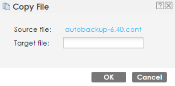 Copy | Use this button to save a duplicate of a configuration file on the Zyxel Device. Click a configuration file’s row to select it and click Copy to open the Copy File screen. ![]() Specify a name for the duplicate configuration file. Use up to 25 characters (including a-zA-Z0-9;‘~!@#$%^&()_+[]{}’,.=-). Click OK to save the duplicate or click Cancel to close the screen without saving a duplicate of the configuration file. |