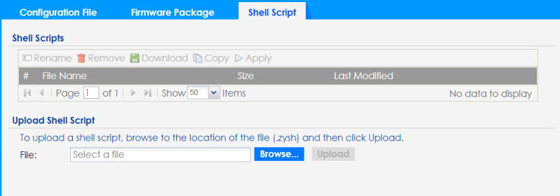 Upload Shell Script The bottom part of the screen allows you to upload a new or previously saved shell script file from your computer to your Zyxel Device. | |