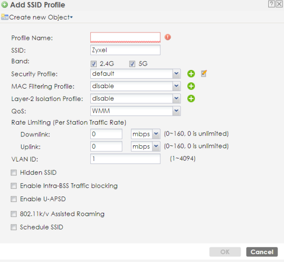 Create new Object | Select an object type from the list to create a new one associated with this SSID profile. |