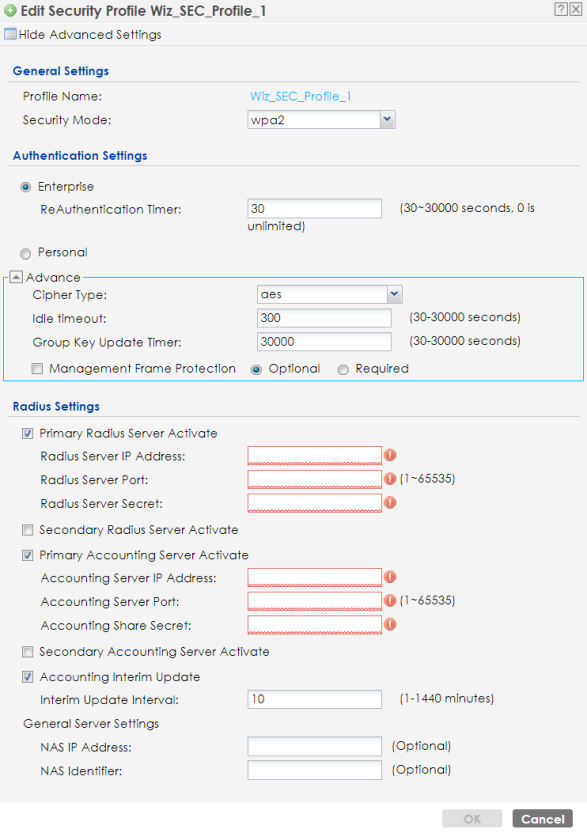 Radius Settings The Radius Settings fields are only available when you set Authentication Settings to Enterprise. | |