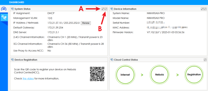 Cloud Control Status | This field displays: • The Zyxel Device Internet connection status. • The connection status between the Zyxel Device and NCC. • The Zyxel Device registration status on NCC. Mouse over the circles to display detailed information. To pass your Zyxel Device management to NCC, first make sure your Zyxel Device is connected to the Internet. Then go to NCC and register your Zyxel Device. 1. Internet Green - The Zyxel Device is connected to the Internet. Orange - The Zyxel Device is not connected to the Internet. 2. Nebula Green - The Zyxel Device is connected to NCC. Orange - The Zyxel Device is not connected to NCC. 3. Registration Green - The Zyxel Device is registered on NCC. Gray - The Zyxel Device is not registered on NCC. |