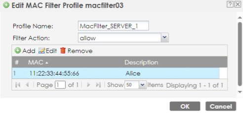 8 Enter the MAC address of the device Alice uses to connect to the network in Set 1’s MAC Address field and enter her name in the Description field, as shown in the following figure. Change the Profile Name to “MacFilter_SERVER_1”. Select Allow from the Filter Action field and click OK.