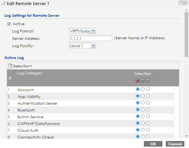 Backing up logs to a remote server allows you to store large amounts of log data and prevent log data lost on your Zyxel Device. The Zyxel Device can keep at most 512 logs. If the logs exceed this number, the oldest logs will be lost.
