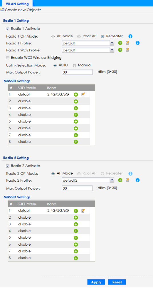 Radio 1 OP Mode | Select the operating mode for radio 1. AP Mode means the radio can receive connections from WiFi clients and pass their data traffic through to the Zyxel Device to be managed (or subsequently passed on to an upstream gateway for managing). Root AP means the radio acts as an AP and also supports the wireless connections with other APs (in repeater mode) to form a WDS (Wireless Distribution System) to extend its wireless network. Repeater means the radio can establish a wireless connection with other APs (in either root AP or repeater mode) to form a WDS. |