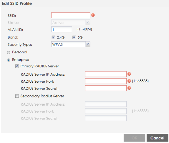 • Enterprise: Select this to store passwords for users on an external RADIUS authentication server. Select Primary / Secondary RADIUS Server checkbox to have the Zyxel Device use the specified RADIUS server. You have to enter the IP address, port number and shared secret password of the RADIUS server to be used for authentication.