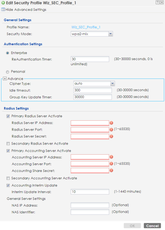 Radius Settings The Radius Settings fields are only available when you set Authentication Settings to Enterprise. | |