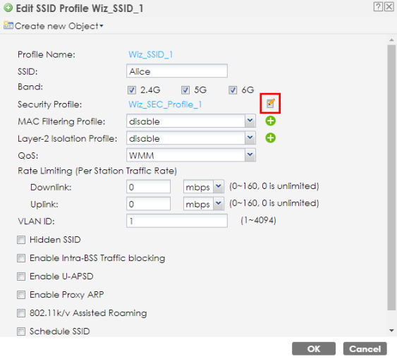 1 Go to the Configuration > Wireless > AP Management > WLAN Setting screen. Click Edit under the SSID profile to change the WiFi security.