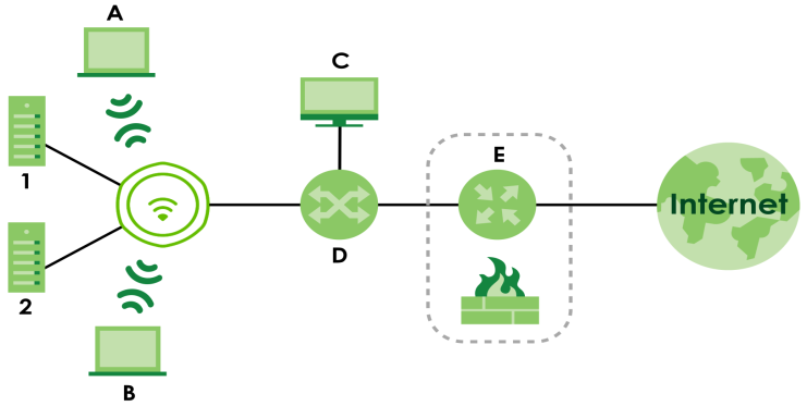 For the Guest WiFi, enable Enable Intra-BSS Traffic blocking to prohibit Guest WiFi clients from directly connecting to each other. To separate the Guest WiFi network from the General internal WiFi network, create two VLANs, VLAN 10 and VLAN 20, on your firewall (F), such as ZyWALL. Set the General WiFi network to be in VLAN 10, where your internal network is. Set the Guest WiFi network to be in VLAN 20. This way, Guest WiFi clients will not be able to access the wired LAN network of the firewall (F) in VLAN 10 while still able to access the Internet.