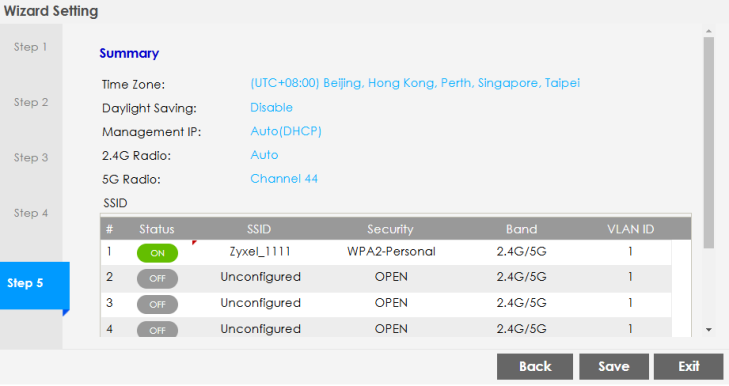 Use this screen to check whether what you have configured is correct. Click Save to apply your settings and complete the wizard setup. Otherwise, click Back to return to the previous screen or click Exit to close the wizard without saving.