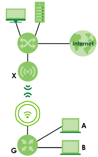 The following figure shows an example of a WDS with a repeater acting as a wireless bridge. The root AP (X) is connected to a network with Internet access. The wireless repeater (Y) is connected to the root AP (X) to expand the network. Clients (A and B) are connected to the wireless repeater through the switch/gateway/router (G). They can access the network with the extended wired network the wireless bridge (wireless repeater) provides.