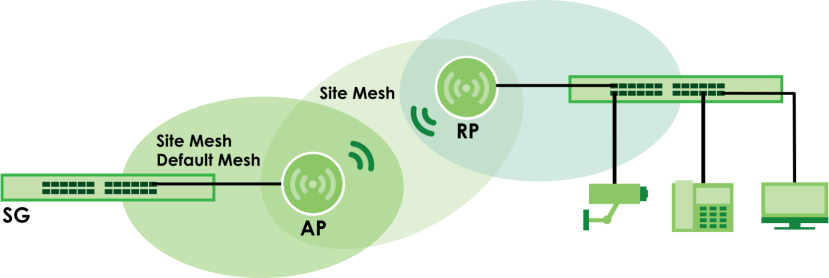 To use wireless bridge, enable Wireless Bridge on two Nebula Devices (AP, RP) in NCC. Then connect wired clients to one of the Nebula Device’s LAN port. These wired clients form a new network segment and are able to reach the site gateway (SG) through the Nebula Device’s WiFi connection.