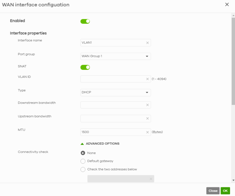 Upstream bandwidth | Enter the upstream bandwidth of the WAN connection. This value is used for WAN load balancing by algorithms such as weighed round robin. |