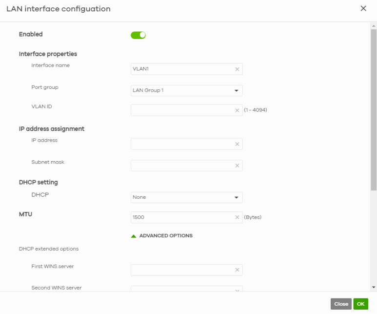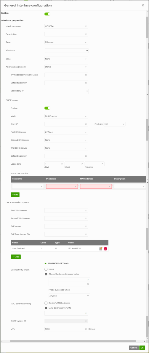 Default gateway | If you set this interface to DHCP server, you can select to use either the interface’s IP address or another IP address as the default router. This default router will become the DHCP clients’ default gateway. |