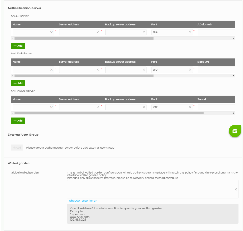 Global walled garden | With a walled garden, you can define one or more web site addresses that all users can access without logging in. These can be used for advertisements for example. Specify walled garden web site links, which use a domain name or an IP address for web sites that all users are allowed to access without logging in. |