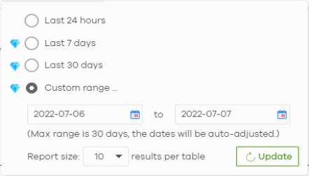 Security Appliance – NSS Analysis | Select to view the report for the past day, week or month. Alternatively, select Custom range... to specify a time period the report will span. You can also select the number of results you want to view in a table. ![]() |