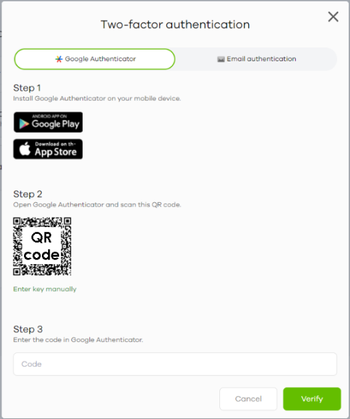 6 The following screen appear. Activate the two-step verification service using the Google Authenticator app or your email address. If you select Google Authenticator, install the app on your smartphone and scan the QR code on the NCC web screen to get a 6-digit one-time code. Then enter the code and click Verify to authenticate your identity.