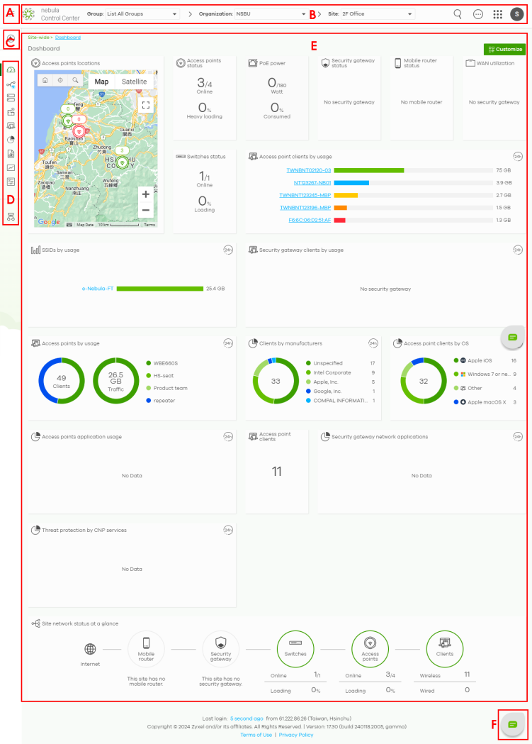 Access points / Switches / Security router / Firewall / Security gateway / Mobile router / Accessories | Use this menu to view Nebula Device connection status and traffic summary. | |