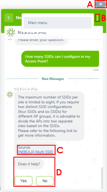 D | Click Yes if the AI-generated answer is helpful. This increases Chatbot AI’s association of your query to the topic in the Chatbot source. Alternatively, click No if the AI-generated answer is unhelpful. |