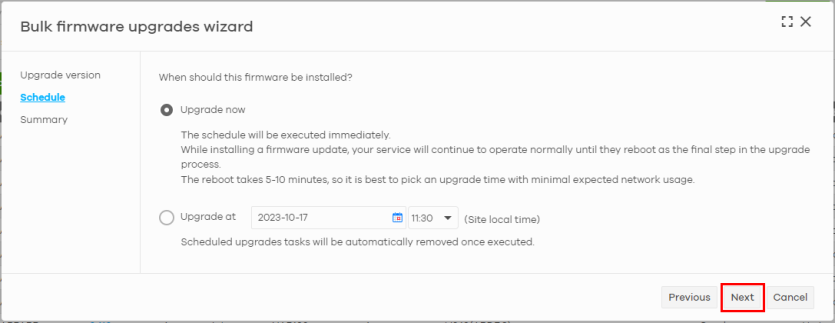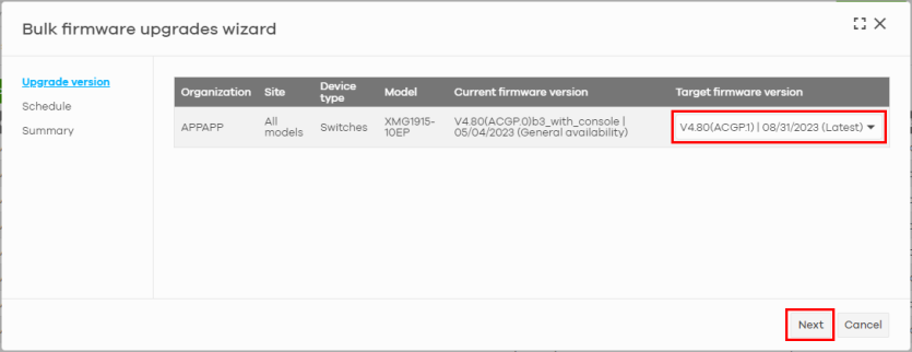 Schedule | Click this to run the wizard to set a specific date and time to upgrade firmware to Nebula Devices in the selected organizations and sites. |
