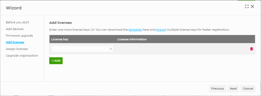 template | Click this to download an XLSX file that you can use as a template to import a large number of licenses at once. Follow the instructions and formatting in the template to add the license keys. |