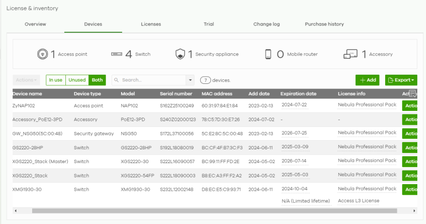 In use / Unused / Both | Select to display the Nebula Device currently in a site (In use), not current (Unused), or show all (Both). |