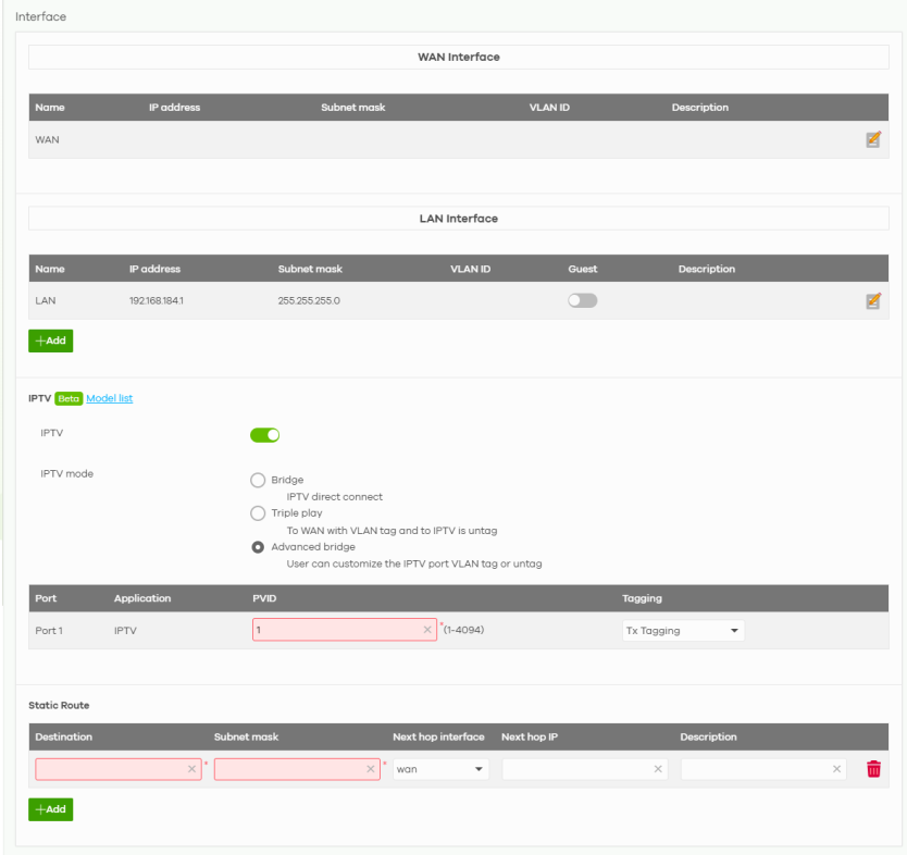 Tagging | This field is available only when the IPTV mode is set to Advanced bridge. Select Tx Tagging for the connected manageable Switch to forward IPTV-tagged traffic to the subscribers. If you do not have a connected manageable Switch, select Tx Untag or select Bridge mode in IPTV mode. |
