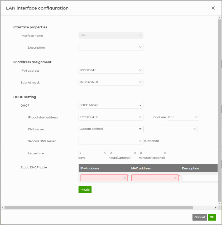 Static DHCP table | Configure a list of static IP addresses the Nebula Device assigns to computers connected to the interface. Otherwise, the Nebula Device assigns an IP address dynamically using the interface’s IP pool start address and Pool size. |