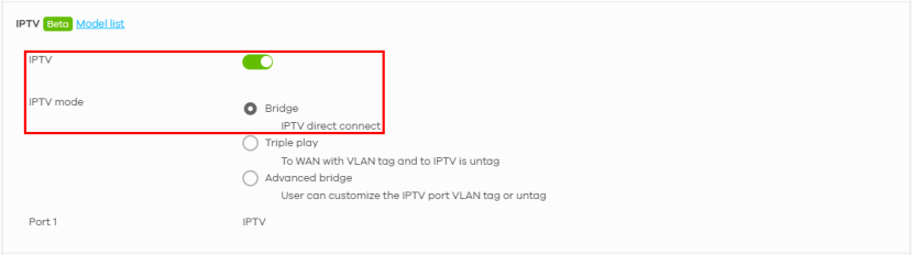 IPTV | Click the switch to the right to turn on the IPTV (Internet Protocol Television) service. IPTV is a service that delivers video traffic over an Internet Protocol (IP) network connection. |