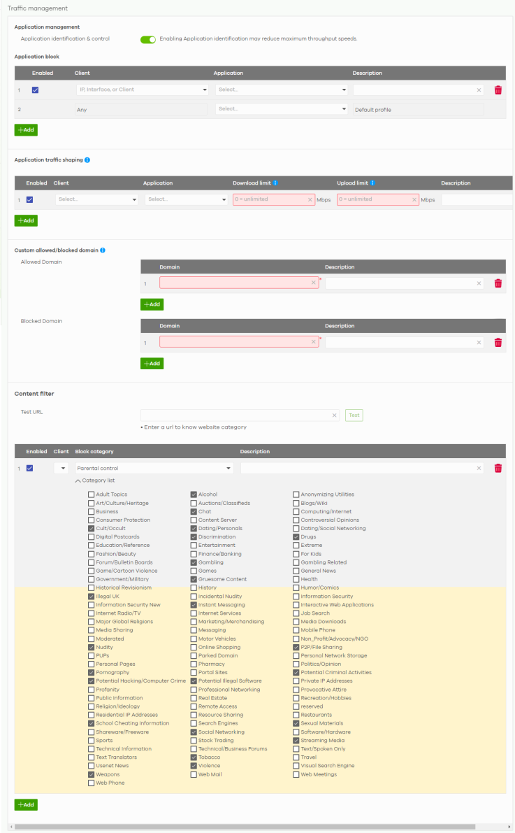 Blocked Domain | If you want to block specific sites, regardless of their content rating, add them to this list. Domain – Enter the host name, such as www.bad-site.com into this text field. Do not enter the complete URL of the site – that is, do not include “http://”. All sub-domains are also blocked. For example, entering “bad-site.com” also blocks “www.badsite.com”, “partner.bad-site.com”, “press.bad-site.com”, and so on. You can also enter just a top level domain. For example, enter .com to block all .com domains. Enter a Description of the blocked domain. You can use alphanumeric and ()+/:=?!*#@$_%- characters, and it can be up to 60 characters long. Click Add to create a domain name profile. |
