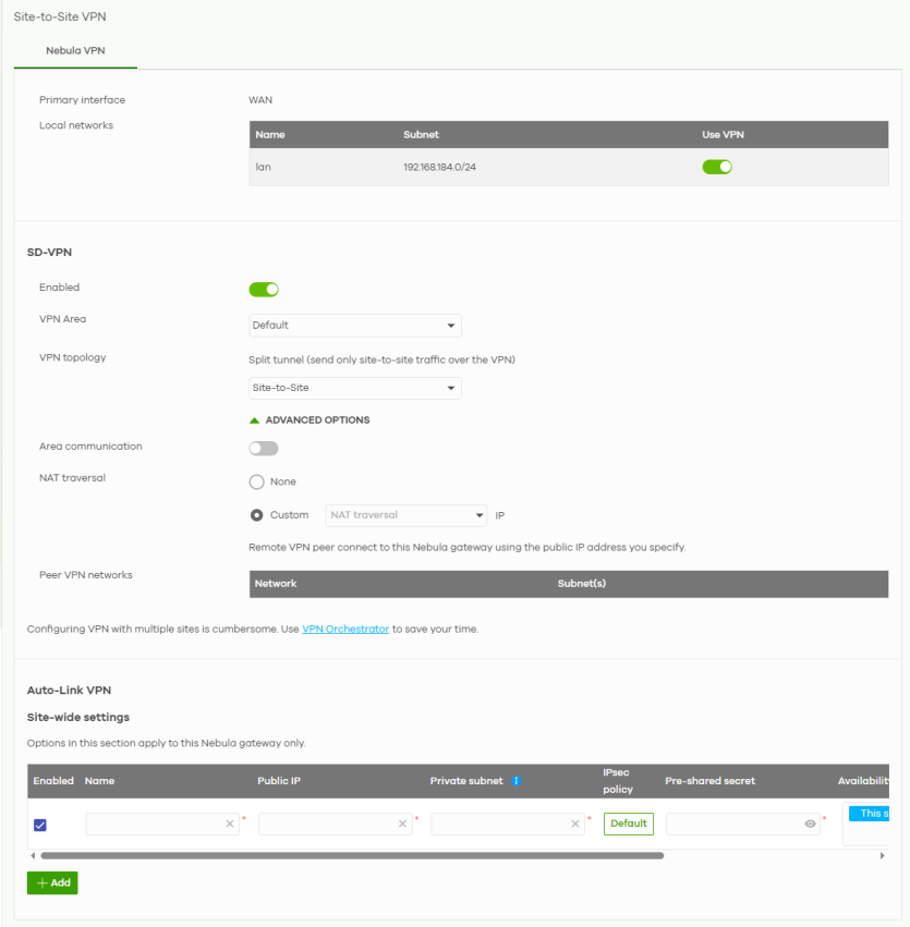 Smart mesh | Click to enable or disable the Nebula Smart Mesh feature on all Nebula Devices in the site. Click Model list to see whether your Nebula Device supports Nebula Smart Mesh. |