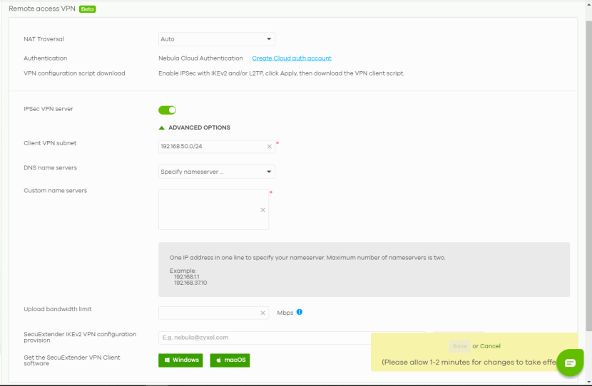 NCAS disconnect behavior | This field is available only when: • you set Sign-in method to Sign-on with Nebula Cloud authentication • you enable MAC-based Authentication with and you select Nebula cloud authentication Select Allowed to allow any users to access the network without authentication when the NCAS (Nebula Cloud Authentication Server) is not reachable. Select Limited to allow only the currently connected users or the users in the white list to access the network. |
