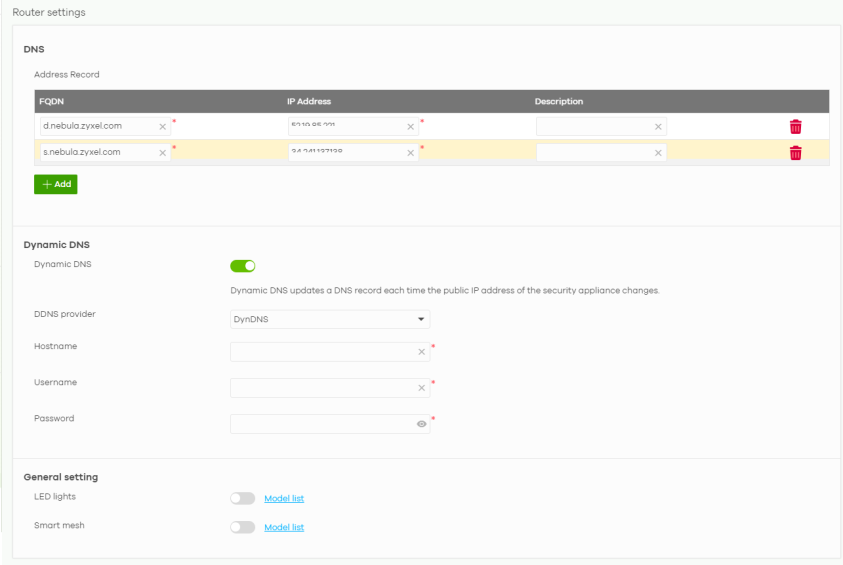 LED lights | Click to turn on or off the LEDs on the Nebula Devices. Click Model list to see the supported Security router. |