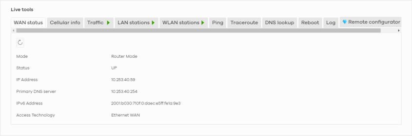 Cellular info | This shows the connection status of the cellular WAN interface. See Cellular Info for more information. |