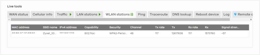 WLAN stations (indoor NCCs only) | This shows the Nebula Device’s connected WiFi clients’ MAC address, SSID name, IPv4 address, Signal strength, Security, Channel, Tx rate, Rx rate, Tx/Rx, and Capability. See WLAN Stations for more information. |