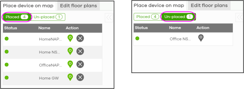 Click the Placed button to show the Nebula Devices that you have pinned on the map and/or the floor plan. Click the Un-placed button to show the Nebula Devices that remain to be pinned on the map. To pin a Nebula Device, select the Nebula Device from the Un-placed list, then drag and drop it on the map.