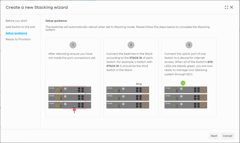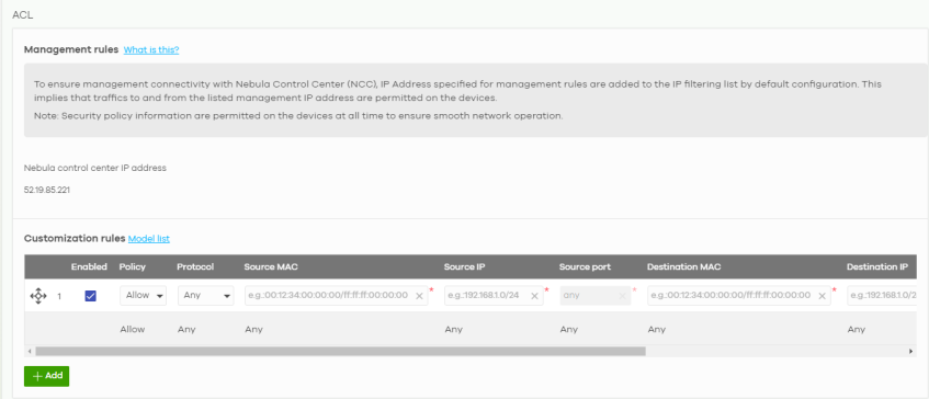 Port mirroring | Click Add to create a new entry. Select the Nebula Device/stacking system for which you want to configure port mirroring, specify the destination port you copy the traffic to in order to examine it in more detail without interfering with the traffic flow on the original ports, and also enter the source port on which you mirror the traffic. If the port is on a stacking Nebula Device, enter the slot ID/port number to specify the destination and source ports. For example, to specify slot ID 2 port 20 in a stacking system, enter ‘2/20’. |