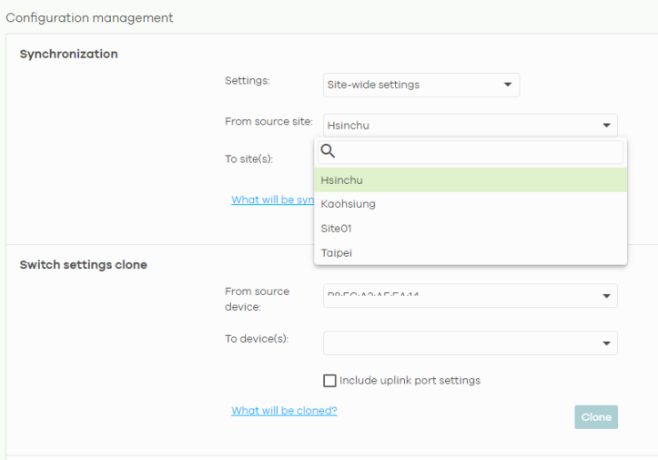 2 Go to the Organization-wide > Organization-wide manage > Configuration management screen. Under Synchronization, select the Site-wide settings in Settings to copy a site’s general setting to another site.