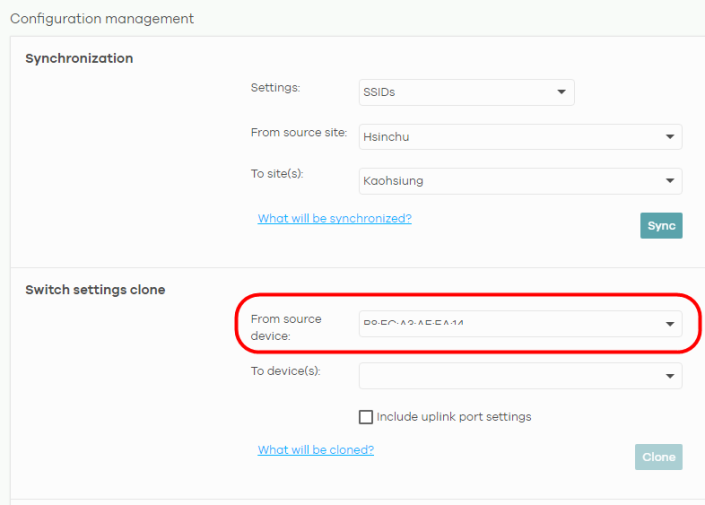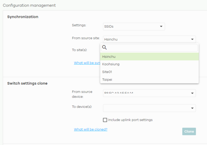 1 Go to Organization-wide > Organization-wide manage > Configuration management screen. Under Synchronization, select SSIDs to copy a site’s SSIDs settings to another site. The duplicated SSIDs include the authentication and captive portal settings.