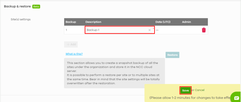 2 Enter a name for the backup in Description in order to save it to the NCC. You can use alphanumeric and ()+/:=?!*#@$_%- characters, up to 512 characters. Then click Save.