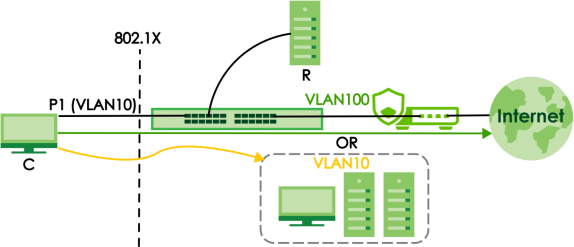 The login account passes IEEE 802.1x port authentication with dynamic VLAN assignment. Client (C) will connect to the network through VLAN100.