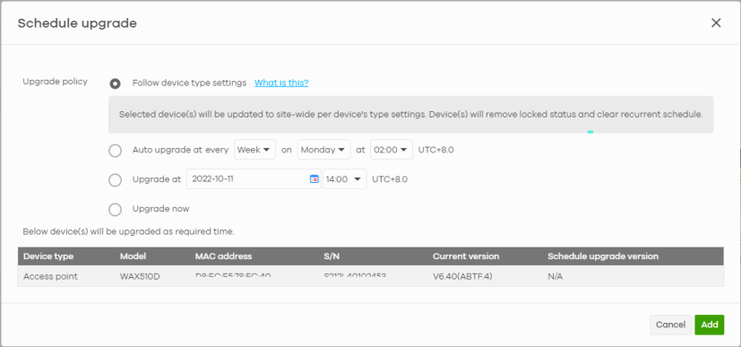 • Select Follow device type settings to upgrade the Nebula Device according to the site-wide schedule configured for all Nebula Devices in the site.