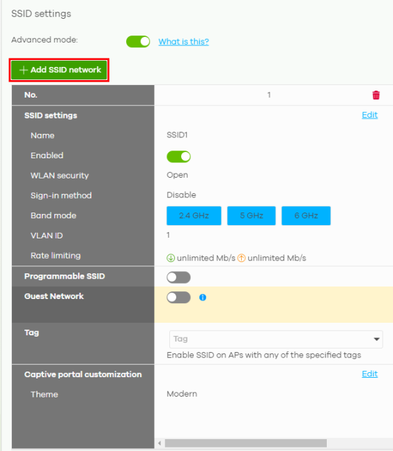 1 Go to Site-wide > Configure > Access points > SSID settings and click + Add SSID network.